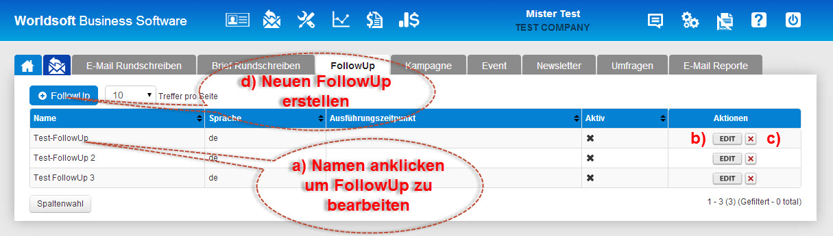 Übersicht FollowUp c) Um einen FollowUp zu löschen klicken Sie auf "X".